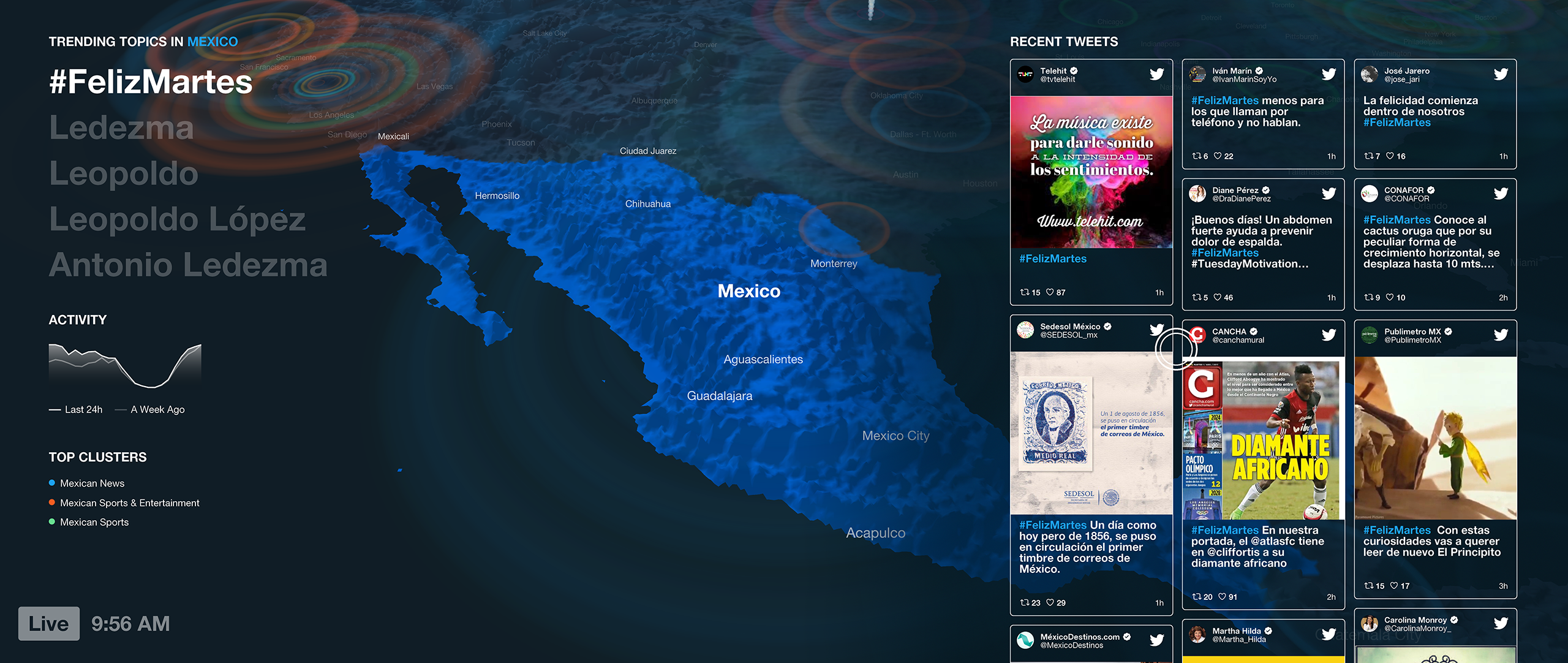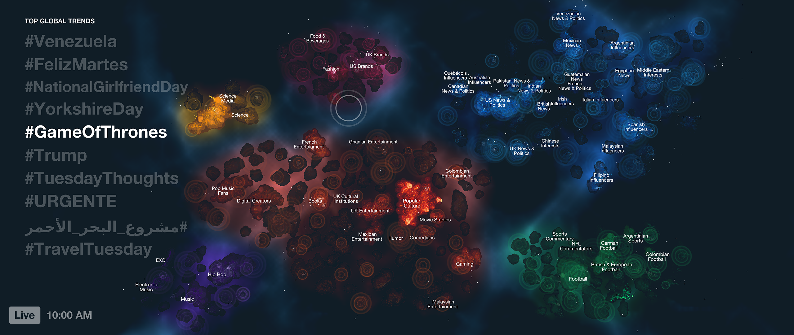 Trend detection in those clusters provides an alternative to the geography-based trending topics shown on twitter.com. It’s an alternative landscape that ignores political boundaries and instead highlights how people speak within interest-based communities.