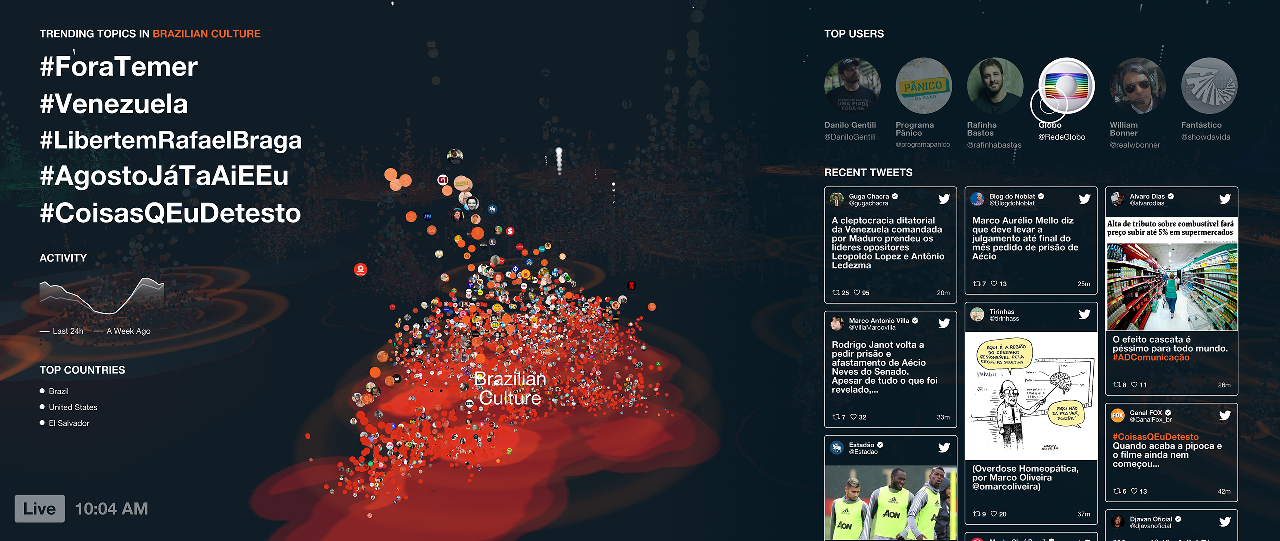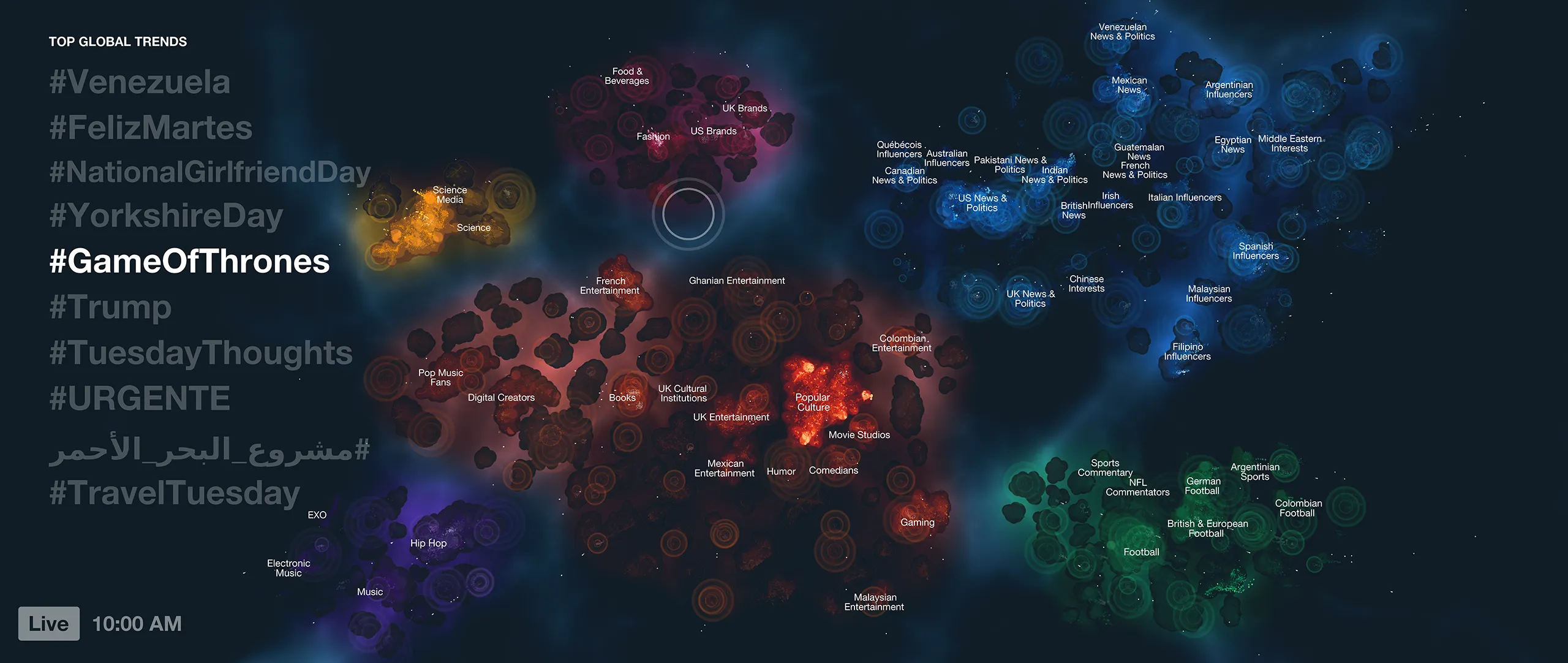 The live data analysis listens for hundreds of tweets per second from these top accounts, then does trend detection on hashtags and phrases found in those tweets, revealing which topics are actively being talked about in particular clusters. Videos about those trends can be exported as well.